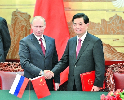 6月5日,中國國家主席胡錦濤在北京人民大會堂與俄羅斯總統普京共同出席兩國相關合作文件簽字儀式。