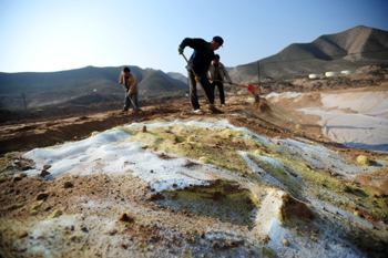 圖為甘肅某地,工人把摻雜了化學試劑的受污染土壤埋入改良工程淋洗池中。新華社記者