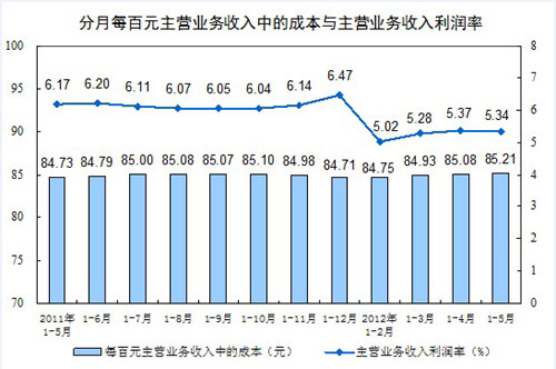 規模以上工業企業實現主營業務收入345023億元,同比增長11.9%。每百元主營業務收入中的成本為85.21元,主營業務收入利潤率為5.34%。