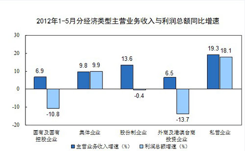1-5月份,在規模以上工業企業中,國有及國有控股企業實現利潤5601億元,同比下降10.8%;集體企業實現利潤291億元,同比增長9.9%;股份制企業實現利潤10779億元,同比下降0.4%;外商及港澳臺商投資企業實現利潤4272億元,同比下降13.7%;私營企業實現利潤5500億元,同比增長18.1%。