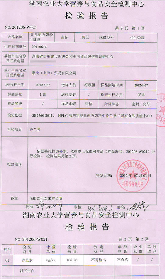 經檢測,標注“美贊臣營養品(中國)有限公司”生產的生產日期為“20111022B2”、批號為“0028887CH1KNW5B”盒裝嬰兒配方奶粉(1階段)和生產日期為“20120418”、批號為“0057427CH2DJN5C”灌裝嬰兒配方奶粉(1階段)兩種型號的產品因含有香蘭素被判不合格。雅培、惠氏等洋品牌的1階段嬰兒配方奶粉均檢測出香蘭素,被判不合格。根據《食品安全國家標準食品添加劑使用規定》GB2760—2011要求,凡使用范圍涵蓋0至6個月嬰幼兒配方食品不得添加任何食用香料。