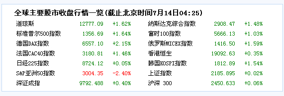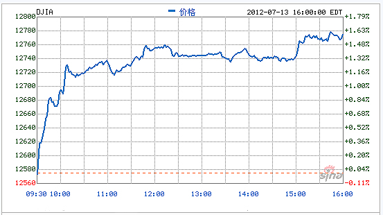 美東時間7月13日16:00(北京時間7月14日04:00),道瓊斯工業平均指數上漲203.82點,報12,777.09點,漲幅為1.62%;納斯達克(微博)綜合指數上漲42.28點,報2,908.47點,漲幅為1.48%;標準普爾500指數上漲22.02點,報1,356.78點,漲幅為1.65%。