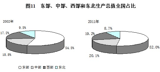 黨的十六大以來,黨中央、國務院陸續部署了繼續推進西部大開發戰略、實施東北地區等老工業基地振興戰略和促進中部地區崛起規劃和鼓勵東部地區率先發展政策,系統制定了促進邊疆民族地區經濟社會加快發展的政策措施,密集出臺了一批經濟區、經濟帶發展規劃,實施了全國主體功能區規劃和促進產業轉移的政策措施。在各項政策支持和各地區努力下,西部地區基礎設施建設取得突破性進展。青藏鐵路、西氣東輸、西電東送、支線機場、干線公路相繼建設完工;中部地區承東啟西的區位優勢進一步凸顯,生態經濟區、城市群和綜合交通樞紐建設快速發展;東北地區資源型城市轉型以及國有企業、國有林區墾區等多項改革扎實推進。各地區發展潛力不斷釋放,區域比較優勢得到充分發揮,呈現出協調發展的趨勢。2011年,中部地區、西部地區地區生產總值占全國的比重分別為20.1%、19.2%,分別比2002年提高1.3、2.0個百分點。2011年,中部地區、西部地區、東北地區全社會固定資產投資占全國的比重分別為23.2%、23.5%和10.7%,分別比2002年提高5.5、3.2和2.4個百分點。