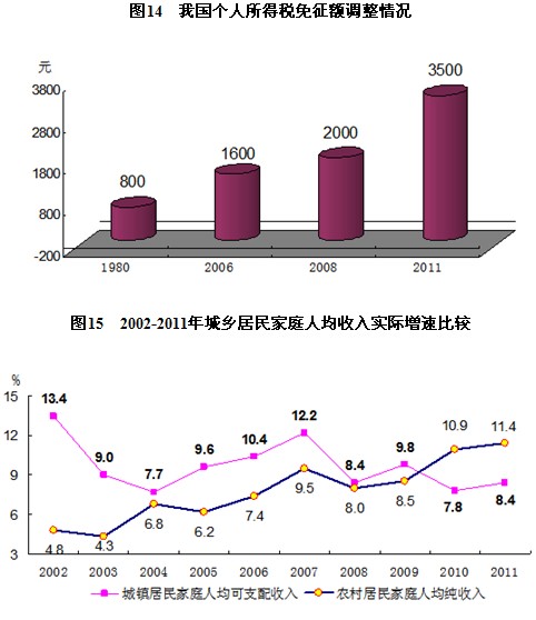 黨的十六大以來,黨中央堅持民生優先,把保障和改善民生作為一切工作的出發點和落腳點,逐步推進分配領域的各項改革,通過大力支持擴大就業,提高勞動工資最低標準,提高退休工資,不斷提高對低收入群體的轉移支付水平和覆蓋面,三次調高個人所得稅起征點等政策措施,千方百計拓寬增收渠道,提高居民收入水平。特別是把增加農民收入作為農村工作的中心任務,促進增產增收、優質增收、提價增收、務工增收、補貼增收,農民收入實現了連續多年較快增長。2011年,城鎮居民人均可支配收入21810元,比2002年增長1.8倍,扣除價格因素,年均實際增長9.2%;農村居民人均純收入6977元,比2002年增長1.8倍,扣除價格因素,年均實際增長8.1%。城鄉居民收入年均增速超過1979—2011年7.4%的年均增速,是歷史上增長最快的時期之一。收入持續增長,吃穿住用等均有了很大改善,日子越過越好,主要耐用消費品擁有量大幅增長。2011年底,農村居民家庭平均每百戶擁有電冰箱61.5臺,增長3.1倍;空調機22.6臺,增長8.9倍;擁有移動電話179.7部,增長12.1倍。