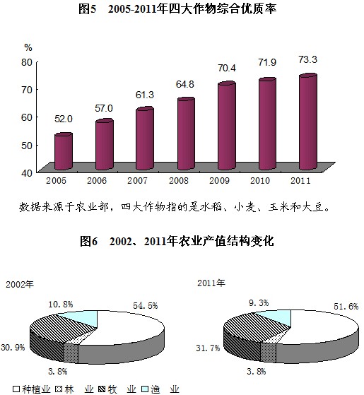農業生產穩步發展,優質農產品比重明顯上升,農業基礎地位不斷穩固。黨的十六大以來,黨中央、國務院確立了把解決好“三農”問題作為全黨工作重中之重的戰略思想,制定了“工業反哺農業、城市支持農村”和“多予、少取、放活”的指導方針,部署了加快發展現代農業、建設社會主義新農村的戰略任務,取消了農業稅,實行了對農、畜、林及草原等的直接補貼、良種補貼、農機具購置補貼和農資綜合補貼,全面放開糧食購銷,推進集體林權制度改革,堅持不懈地推進農業科技進步,加快推進現代農業建設,農業生產穩步發展,農業基礎地位不斷穩固。糧食生產扭轉了一度下滑局面,實現了“八連增”。2011年,糧食總產量達到57121萬噸,比2002年增長25.0%,年均增長2.5%,連續5年穩定在5億噸以上,其他主要農產品也穩中有增。與此同時,農業結構不斷優化,優質農產品比重明顯上升,規模化種養、區域化布局、標準化生產加速推進。2011年水稻、小麥、玉米優質化率分別達到81.0%、74.3%和64.6%,分別比2005年提高16.3、25.5和27.7個百分點。大宗農產品生產繼續向優勢產區集中,13個糧食主產省對糧食增產的貢獻達到90%以上。農業物質技術裝備水平穩步提高,農田有效灌溉面積擴大了7300多萬畝,農作物耕種收綜合機械化率提高了18.6個百分點。2011年農業科技貢獻率達到53.5%,有力支撐了農業持續穩定發展。