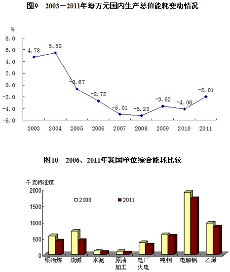 黨的十六大以來,建設資源節約型、環境友好型社會成為加快轉變經濟發展方式、調整經濟結構的重要著力點,節能減排、生態建設和環境保護力度明顯加大!笆晃濉币巹澗V要第一次把節能減排列為約束性指標,經濟可持續發展能力不斷增強。單位國內生產總值能耗大幅下降。隨著國家和各地區節能降耗工作力度的不斷加大,各項政策措施逐步深入落實,節能降耗取得明顯成效。2011年,單位國內生產總值能耗比2002年下降12.9%。2011年,單位銅冶煉綜合能耗比2006年下降28.3%,燒堿生產綜合能耗下降38.8%,水泥綜合能耗下降26.8%,原油加工單位綜合能耗下降25.3%,電廠火力發電標準煤耗下降16.1%,鋼綜合能耗下降6.6%,電解鋁綜合能耗下降10.1%,乙烯生產綜合能耗下降11.0%。高耗能行業發展得到抑制,部分落后產能逐步淘汰。為抑制高耗能行業盲目擴張,黨的十六大以來,我國對高耗能行業中淘汰類、限制類企業實行差別電價,并不斷提高加價標準。出臺支持節能的稅收優惠政策,對貸款實行差別定價,嚴控對高耗能、高污染企業的信貸投入,加大對環保企業和項目的信貸支持,改善環保領域的直接融資服務,大幅增加對節能減排的投入。六大高耗能行業增長明顯減緩。2005-2011年,規模以上工業中,六大高耗能行業工業增加值平均增長14.5%,低于規模以上工業增加值平均增速0.5個百分點。污染物排放總量得到控制,環境質量持續改善。2010年,化學需氧量和二氧化硫排放量比2005年分別下降12.45%和14.29%。2011年末,城市污水處理廠日處理能力達11255萬立方米,比2002年末增長2.1倍;城市污水處理率達到82.6%,提高42.6個百分點。2011年,七大水系的水質監測斷面中,Ⅰ~Ⅲ類水質斷面比例占56.3%,比2005年提高15.3個百分點。在監測城市中空氣質量達到二級以上(含二級)標準的城市占監測城市數的88.8%,比2005年提高28.7個百分點。