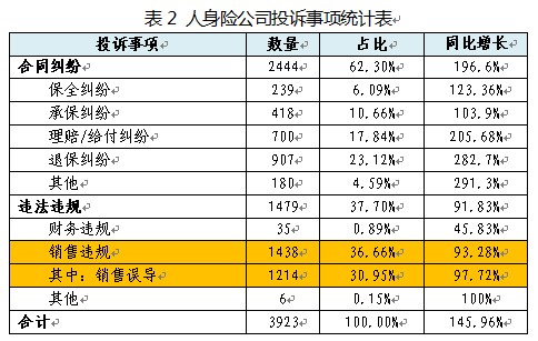 (三)人身險公司投訴中違法違規類、合同糾紛類投訴均有較大幅度的增長,銷售誤導投訴仍居高不下
