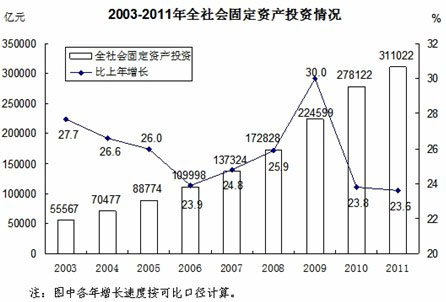 2003-2011年,累計(jì)完成全社會(huì)固定資產(chǎn)投資1448711億元,年均增長25.6%。年度全社會(huì)固定資產(chǎn)投資由2002年的43500億元增加到2011年的311022億元,投資規(guī)模增加了6倍多,是改革開放以來增速較高、持續(xù)時(shí)間較長的一個(gè)時(shí)期。