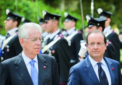 9月4日,在意大利首都羅馬的瑪達馬別墅,意大利總理蒙蒂(左)歡迎到訪的法國總統奧朗德(右)。