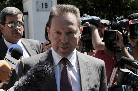 希臘財政部長斯圖納拉斯10日與歐盟委員會、國際貨幣基金組織、歐洲央行的代表在希臘首都雅典舉行會談。斯圖納拉斯在會后對媒體表示,“我們已向三大救助機構遞交了總額115億歐元的緊縮方案,該方案已經進入他們的評估和討論程序。” 據悉,國際救助機構代表將于10月出臺評估報告,而評估報告將直接關系到希臘能否獲得下一輪國際救助資金。 圖為斯圖納拉斯在會談后接受媒體采訪。