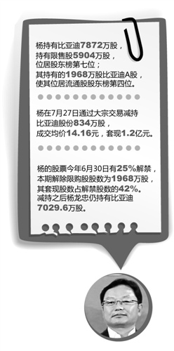 早在今年6月30日其限售股解禁后,楊龍忠便開始套現,但其時套現的還有副董事長呂向陽等在內的6名比亞迪高管,累計成交5453.64萬股,成交金額8.69億元。其中楊龍忠在7月27日通過大宗交易減持比亞迪股份834萬股,成交均價14.16元,套現1.2億元。