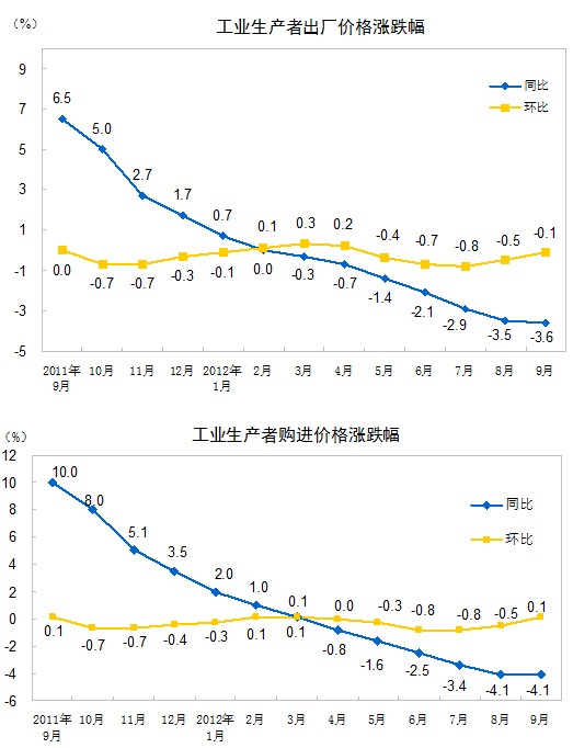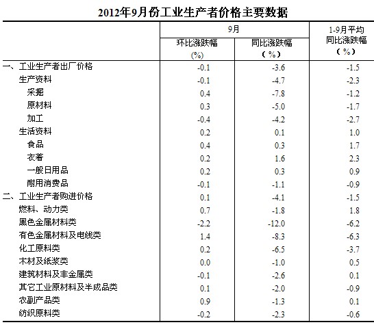 2012年9月份,全國工業生產者出廠價格同比下降3.6%,環比下降0.1%。工業生產者購進價格同比下降4.1%,環比上漲0.1%。1—9月平均,工業生產者出廠價格同比下降1.5%,工業生產者購進價格同比下降1.5%。