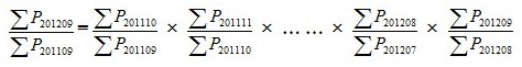 3、同比價格指數的計算方法。由于部分城市用以計算同比價格指數的基期網簽數據缺失,故不能計算2012年10月前各月與網簽數據同一口徑的同比價格指數。為保持同比價格指數計算和發布的連續性和穩定性,滿足有關方面的需要,國家統計局采用有關房價統計數據和按網簽數據計算的房價數據,根據同比指數和環比指數之間的數學關系,對9月份同比價格指數的計算進行了技術處理:將2011年10—12月的環比數據連乘再乘以今年1—9月的環比數據生成本月同比價格指數。以此類推可計算其他月份的同比價格指數。計算公式表示為: