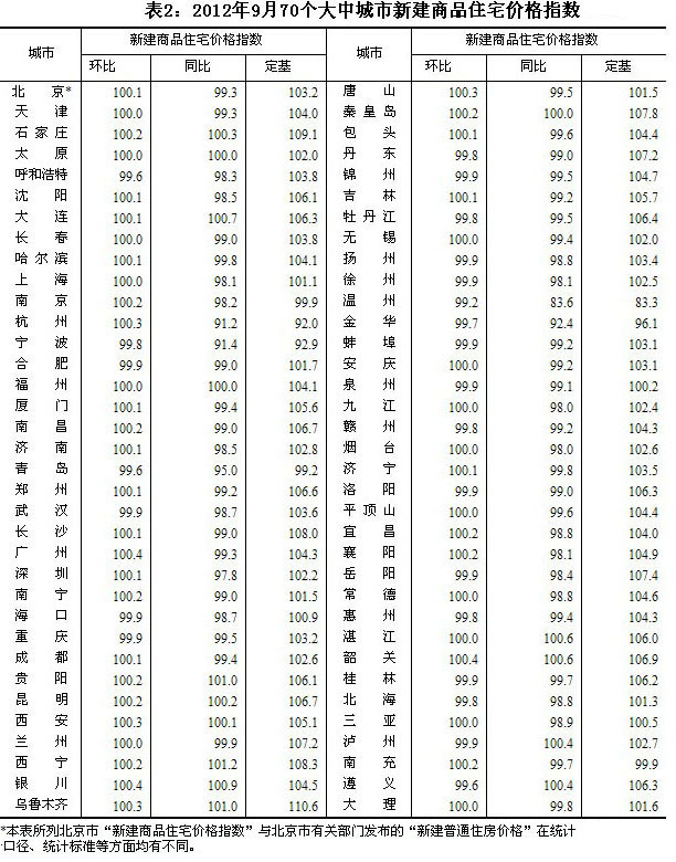 2、現行《住宅銷售價格統計調查方案》自2011年1月起開始實施,2011年10月70個大中城市全部報送了網簽數據。由于各個城市報送網簽數據的初始時間不同步,因此2012年10月前,部分城市的數據與以往歷史數據不完全可比。