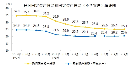 2012年1-9月份,全國民間固定資產投資159412億元,同比名義增長25.1%(扣除價格因素實際增長23.4%),增速與1-8月份持平。民間固定資產投資占固定資產投資的比重為62%,比1-8月份下降0.1個百分點。