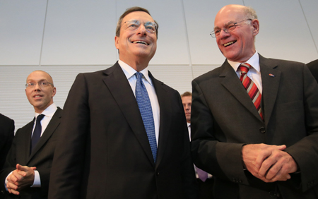 歐洲央行行長德拉吉(左)24日在德國議會下院參加聽證會,就歐洲央行無限額購買受困歐元區國家公債問題發表講話。德拉吉表示,購買債券計劃不會影響歐洲央行的獨立性,不會帶來額外風險,不會引發通貨膨脹。