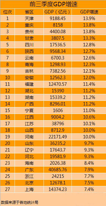 根據各地公布的數據,中新網財經頻道統計發現,在已經公布的這27個省份中,天津以13.9%的增速居首,重慶(13.8%)和貴州(13.8%)并列第二,而上海增速墊底,僅為7.4%。