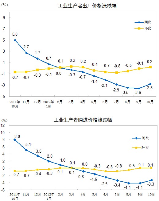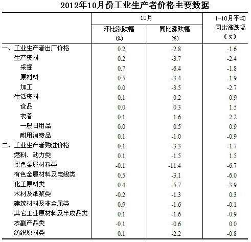 2012年10月份,全國工業生產者出廠價格同比下降2.8%,環比上漲0.2%。工業生產者購進價格同比下降3.3%,環比上漲0.1%。1—10月平均,工業生產者出廠價格同比下降1.6%,工業生產者購進價格同比下降1.7%。
