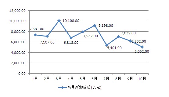 央行2012年11月12日公布社會融資規模數據,數據顯示10月人民幣信貸增加5052億元,創下了自2011年10月以來13個月新低,同比少增816億元。