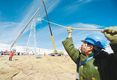 2012年11月6日,在海拔4915.7米的巴顏喀拉山口,玉樹聯(lián)網(wǎng)工程最高海拔鐵塔成功組立(新華社 吳剛攝)