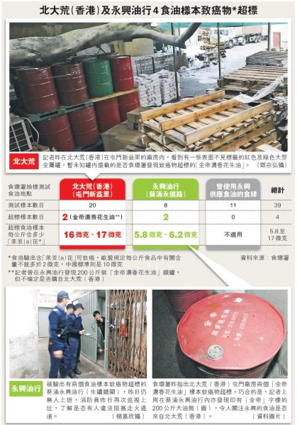 香港食環署上周到懷疑無牌食品加工場、糧油供貨商和13間食肆抽取39個樣本化驗,其中兩個來自屯門“北大荒”糧油供貨商的兩個“金帝濃香花生油”樣本,分別驗出含每公斤16和17微克“苯并(a)芘”,較國家標準每公斤10微克,多出6至7成;而現時歐盟標準為每公斤2微克,其樣本亦超出7至7.5倍。