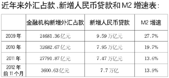 這一變化使得2012年的貨幣供應模式發生轉變。外匯占款結束了連續數年的高增長,前11個月僅增長3600.63億元。預計全年的新增人民幣貸款也將控制在8.3萬億規模。故此,機構大多預期,今年M2增速可以控制在年初制定的14%的控制目標。