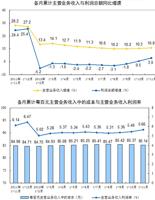 1-11月份全國規模以上工業企業實現利潤46625億元,同比增長3%。11月當月實現利潤6385億元,同比增長22.8%。