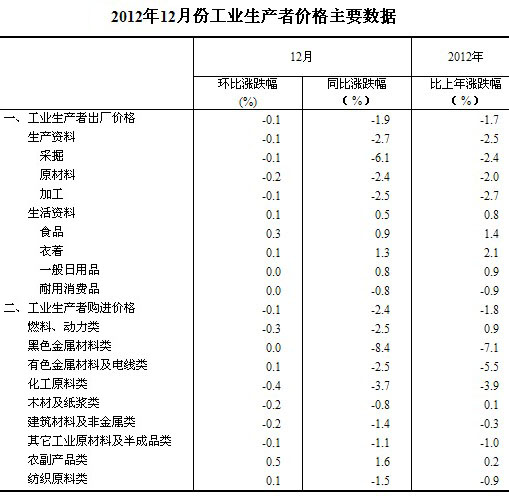 2012年12月份,全國工業生產者出廠價格同比下降1.9%,環比下降0.1%。工業生產者購進價格同比下降2.4%,環比下降0.1%。2012年,工業生產者出廠價格比上年下降1.7%,工業生產者購進價格比上年下降1.8%。