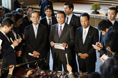 日本副首相兼財相麻生太郎(中)、日本央行行長白川方明(左)與經濟財政政策擔當大臣甘利明22日出席新聞發布會,共同發表聯合聲明。麻生太郎表示,日本政府高度認同日本央行推行新的貨幣寬松政策。當日,日本央行在結束為期兩天的金融政策會議后宣布,引入2%的通脹目標,并決定自2014年起實施每月定期購入資產的“無限期”貨幣寬松措施。有媒體指出,日本央行的這一手法實際上與美聯儲的“無上限貨幣寬松”如出一轍。濫發貨幣可能導致日元長期國債信用度下降,利率攀升,給金融市場埋下隱患。
