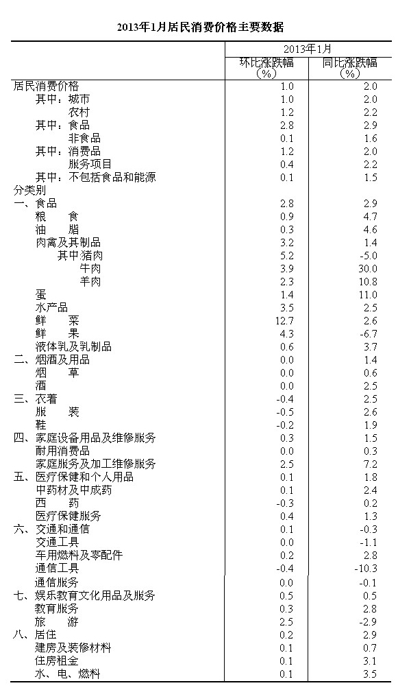 2013年1月份,全國居民消費(fèi)價格總水平同比上漲2.0%。其中,城市上漲2.0%,農(nóng)村上漲2.2%;食品價格上漲2.9%,非食品價格上漲1.6%;消費(fèi)品價格上漲2.0%,服務(wù)價格上漲2.2%。