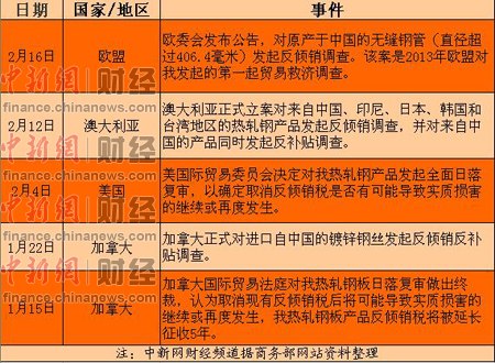 工信部公布的數據顯示,去年80家重點鋼鐵企業銷售利潤率幾乎為零,今年鋼鐵業面臨的形勢卻并未好轉,中新網財經頻道發現,不足2月的時間里,歐盟、美國、澳大利亞等國對中國鋼材產品發起5起反傾銷調查或終裁,涉及無縫鋼管、熱軋鋼產品等多種產品類型。面對頻發的調查,鋼鐵行業外貿渠道或被進一步壓縮,將面臨更為嚴峻地挑戰。