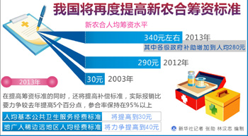 衛生部部長陳竺在21日召開的全國基層衛生與新農合工作會議上說,2013年新農合人均籌資水平提高到340元左右,參合率保持在95%以上,政策范圍內住院報銷比例達到75%,實際補償比力爭提高5個百分點,全國平均達到60%左右,縣鄉兩級實際住院補償比分別達到60%和75%等標準。此外,今年我國還將加快商業保險機構參與新農合經辦服務,開展利用人均15元左右的新農合基金購買大病保險試點。