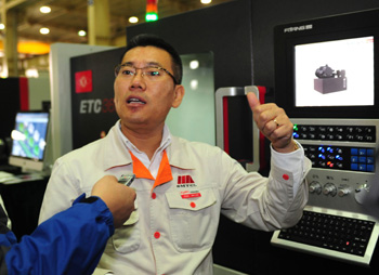 沈陽機床集團董事長關錫友在向記者介紹數控設備。新華社發(姜冰 攝) |