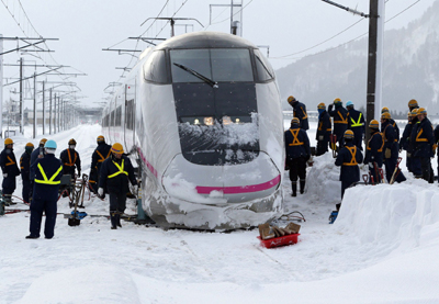 3月3日,在日本秋田縣大山,調(diào)查人員和鐵路工作人員在脫軌列車旁查看。此前一天(3月2日),運(yùn)載著約130名乘客的日本“小町”號(hào)新干線列車在大雪中脫軌。