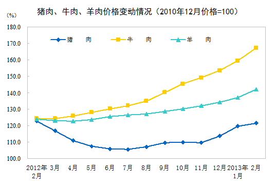 2013年2月份,全國居民消費價格總水平同比上漲3.2%。其中,城市上漲3.2%,農村上漲3.3%;食品價格上漲6.0%,非食品價格上漲1.9%;消費品價格上漲3.3%,服務價格上漲3.1%。