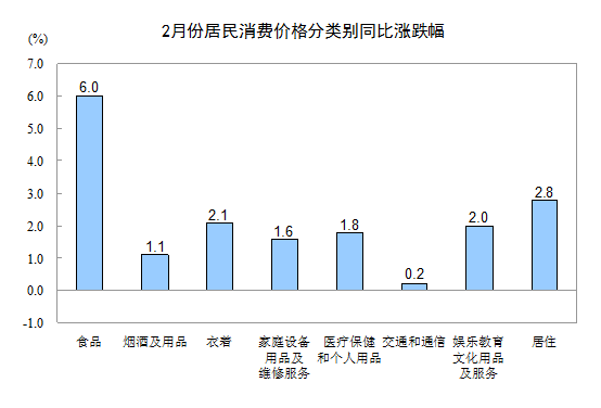 2月份,食品價格同比上漲6.0%,影響居民消費價格總水平同比上漲約1.98個百分點。其中,肉禽及其制品價格上漲5.3%,影響居民消費價格總水平上漲約0.40個百分點(豬肉價格下降1.0%,影響居民消費價格總水平下降約0.04個百分點);鮮菜價格上漲10.0%,影響居民消費價格總水平上漲約0.34個百分點;水產品價格上漲7.7%,影響居民消費價格總水平上漲約0.20個百分點;糧食價格上漲5.1%,影響居民消費價格總水平上漲約0.15個百分點;鮮果價格上漲3.7%,影響居民消費價格總水平上漲約0.08個百分點;油脂價格上漲4.7%,影響居民消費價格總水平上漲約0.06個百分點。