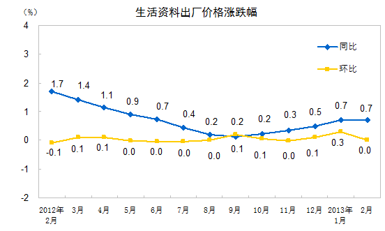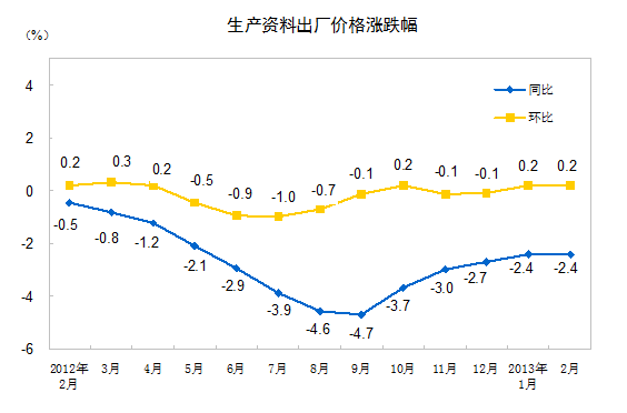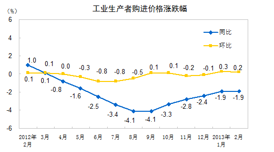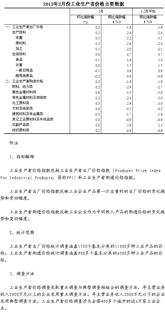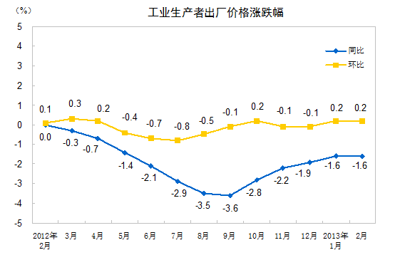 2013年2月份,全國工業生產者出廠價格同比下降1.6%,環比上漲0.2%。工業生產者購進價格同比下降1.9%,環比上漲0.2%。1—2月平均,工業生產者出廠價格同比下降1.6%,工業生產者購進價格同比下降1.9%。