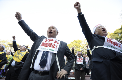 3月12日,日本農業團體代表在東京舉行集會,抗議政府將會在近期同意參加美國主導的《跨太平洋戰略經濟伙伴協定》(TPP)談判。圖為集會者高呼抗議口號。
