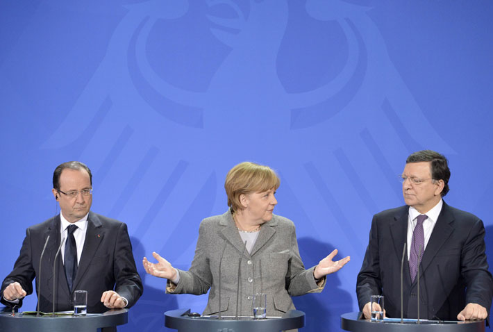 3月18日,法國總統奧朗德(左)、德國總理默克爾(中)和歐盟委員會主席巴羅佐在德國柏林出席歐洲工業家圓桌會議。新華社/法新 |