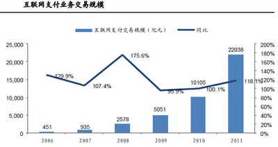 大多數銀行業內人士認為,互聯網支付市場正在對傳統的銀行支付業務構成威脅。數據顯示,2012年互聯網交易的總金額為38412億元,同比增長70.46%,占全年社會消費品零售總額20.72萬億元的18.54%。