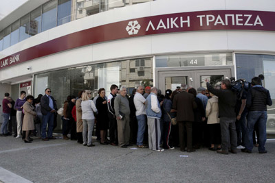 圖為客戶在塞浦路斯第二大銀行Laiki Bank在首都尼科西亞的一家分行門口排隊等待銀行開業。