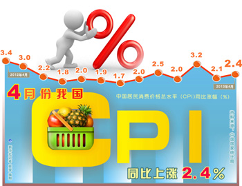 國家統計局9日公布,4月份全國居民消費價格總水平(CPI)同比上漲2.4%,同比漲幅比3月份擴大0.3個百分點,略高于此前市場2.2%至2.3%的預期,環比也由3月份的環比下降轉為4月份的環比上漲0.2%。多方分析認為,鮮菜價格上漲較多是推動4月份CPI上漲的主要原因,受制于經濟回升乏力,二季度物價將保持小幅平穩上漲態勢。但是,考慮到豬肉價格很可能從三季度開始顯著上行,國內外貨幣環境也依舊寬松,下半年物價加速上漲的概率仍然較大。