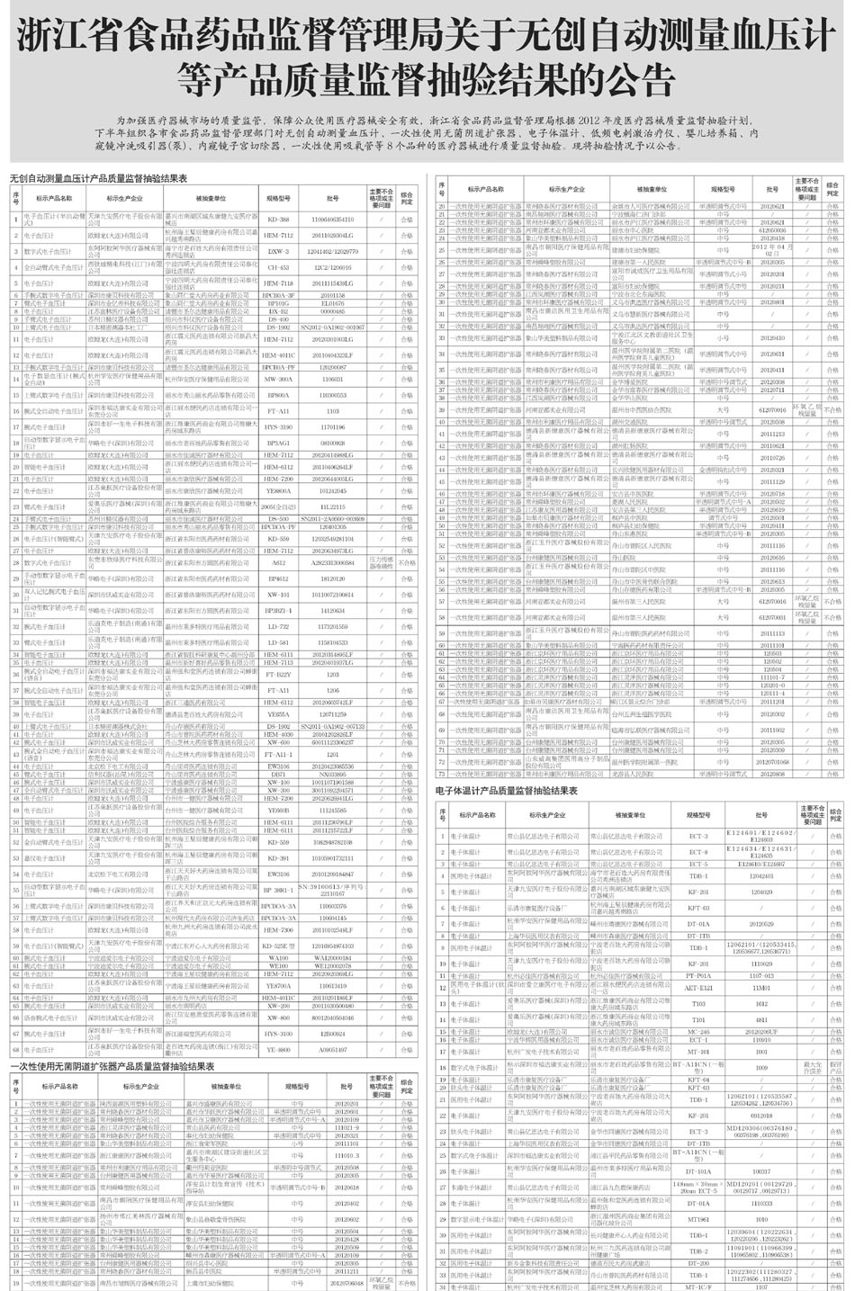 浙江省食品藥品監(jiān)督管理局關(guān)于無創(chuàng)自動測量血壓計等產(chǎn)品質(zhì)量監(jiān)督抽驗結(jié)果的公告