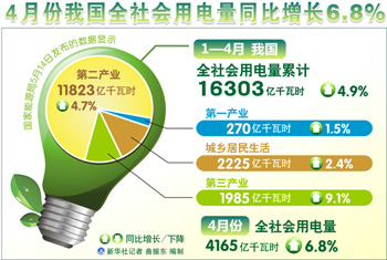 此外,受高耗能產業用電增長拉動,4月重工業用電量繼續回升1.5個百分點。據歐陽昌裕介紹,1-4月份四大高耗能產業用電量累計增幅為4.9%,其中4月份同比增長4.1%,比3月份回升了3.2個百分點。