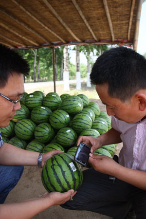 時下,正是西瓜種植大縣——河北省阜城縣“漫河牌”西瓜上市的季節,每一個即將成熟的西瓜上都貼有二維碼,消費者購買時用手機掃描二維碼,就可獲知西瓜的產地、品種、生產標準、授粉日期、種植戶名稱等內容,實現對西瓜的追根溯源。目前,阜城縣4萬畝西瓜已有60%采用了二維碼技術。 |