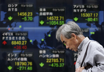 5月23日,在日本首都東京街頭,一名男子從電子股指顯示牌前走過。