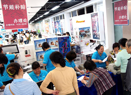 5月26日,一些顧客在上海市的一家商場內辦理“節能補貼”手續。當日是家電節能補貼政策5月31日到期前的最后一個周日,上海市內的各大家電連鎖巨頭都抓住這個時機發起攻勢,銷售場面“翹尾效應”突顯。
