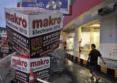 圖為6月15日,一名顧客從泰國首都曼谷的一家萬客隆超市門前走過。