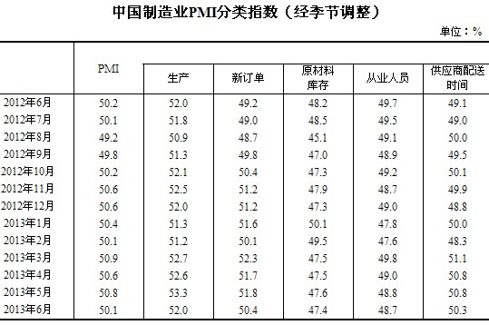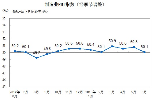 2013年6月,中國制造業采購經理指數(PMI)為50.1%,比上月回落0.7個百分點。