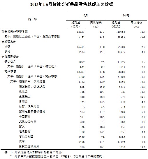 2013年6月份,社會(huì)消費(fèi)品零售總額18827億元,同比名義增長(zhǎng)13.3%(扣除價(jià)格因素實(shí)際增長(zhǎng)11.7%,以下除特殊說(shuō)明外均為名義增長(zhǎng))。其中,限額以上企業(yè)(單位)消費(fèi)品零售額9764億元,增長(zhǎng)11.5%。1-6月份,社會(huì)消費(fèi)品零售總額110764億元,同比增長(zhǎng)12.7%。